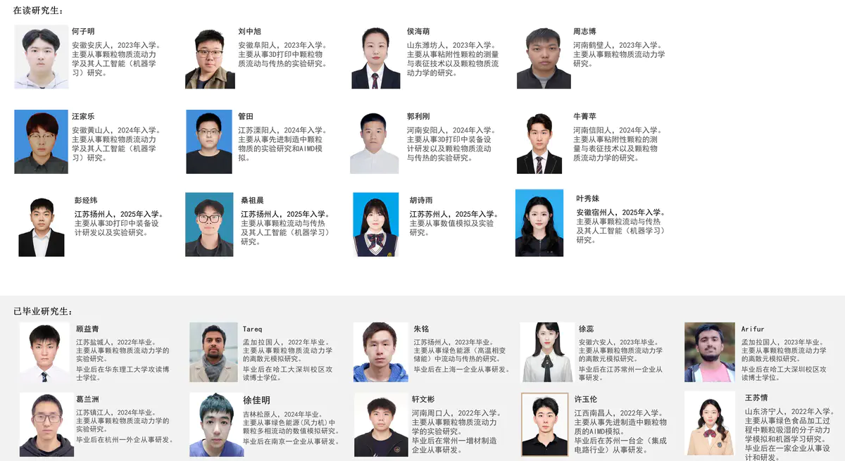 每年招生:机械大类和能源大类的学硕和专硕,每年中国学生4-5名,留学生1-2名,要求:1. 勤奋认真、肯钻研知识;2. 有科研经历或奖学金获得者优先考虑;3. 新生研究方向:颗粒动力学,人工智能(机器学习),先进制造(3D打印)和双碳中物质流动与传热,分子动力学和第一性原理。